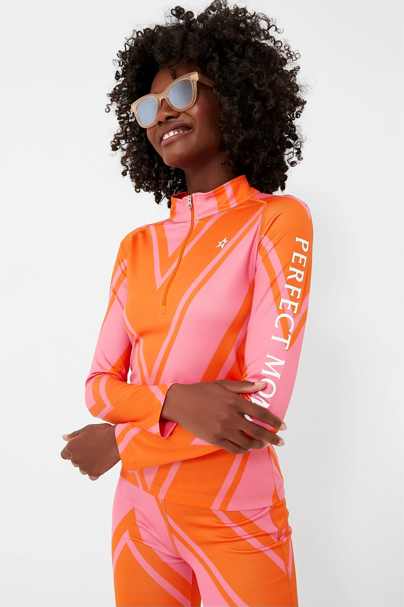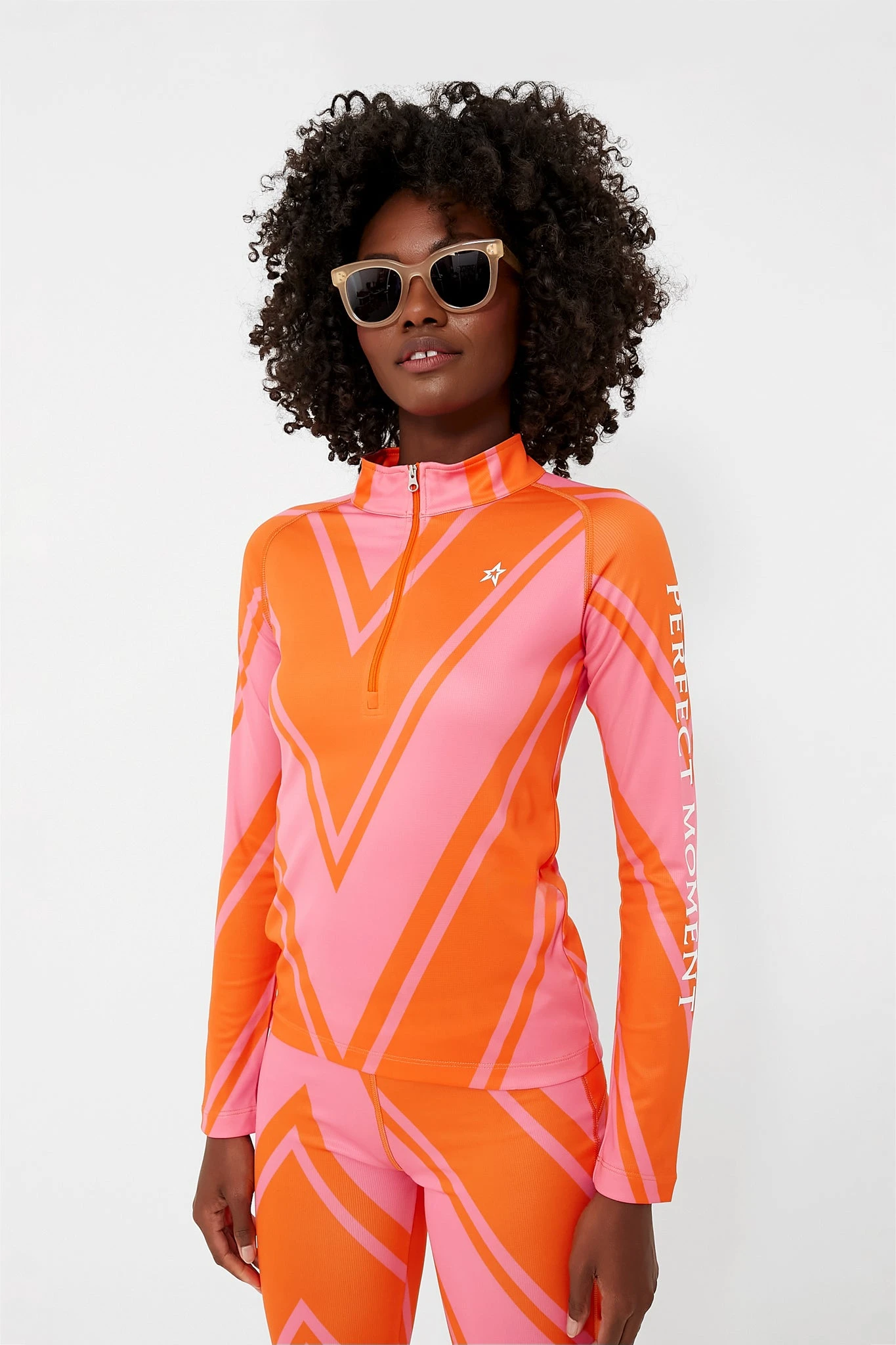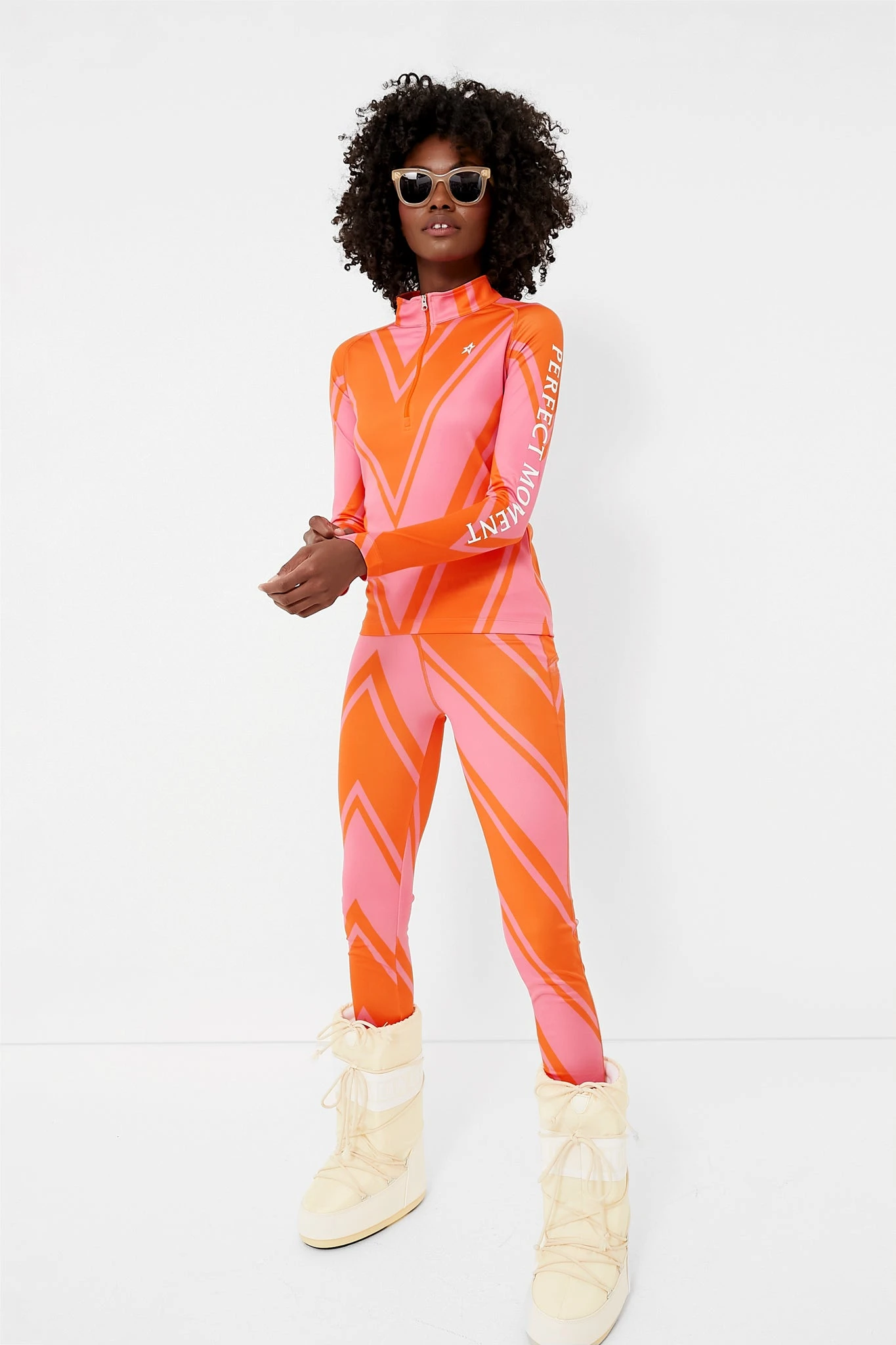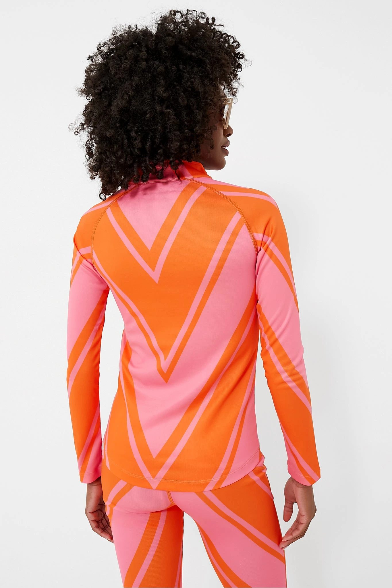 A thermal base layer top is a true essential for any ski trip. Featuring a fitted design, moisture-wicking fabric, long sleeves, and a half-zip mock neck, the Azalea Pink and Orange Chevron Print Thermal Half Zip is a fun, stylish choice for a day on the slopes. This thermal base layer is elevated with a retro neon print and will ensure you are prepared to take on the elements. Pair with the Azalea Pink and Orange Chevron Print Thermal Pant for an adorable matching set.ย