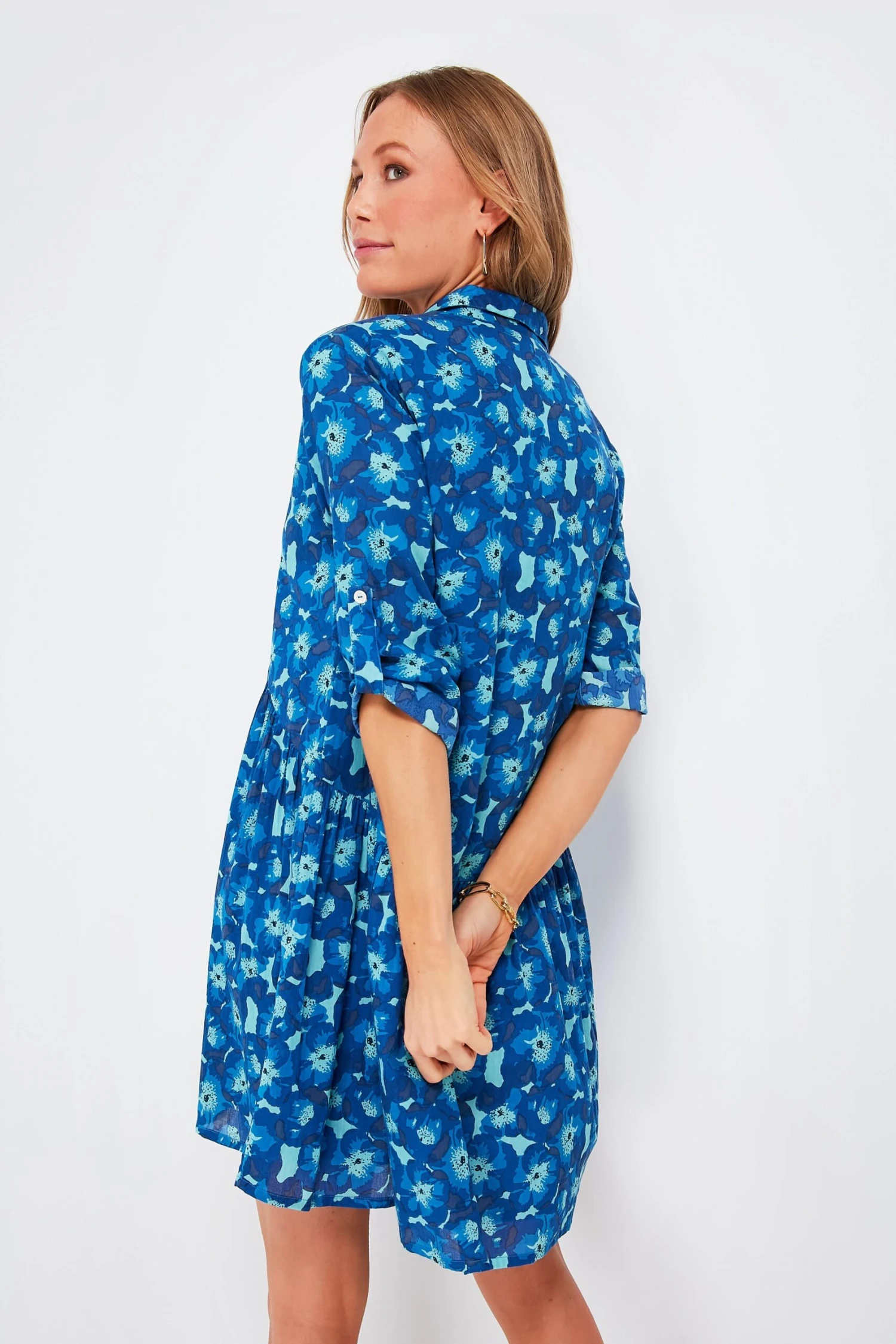 The Jacinta Deauville Dress showcases a bright and bold print in a palette of oceanic blues paired with a breezy cotton silhouette. Perfect for the days when you are manifesting warmer weather, this mini has long sleeves with button tabs to roll them up if needed, and a slightly longer back hem for a twirl-worthy silhouette. We love pairing this with white sneakers and a tote for days of exploring a new city, or with sandals and sunglasses for chilling beachside.
