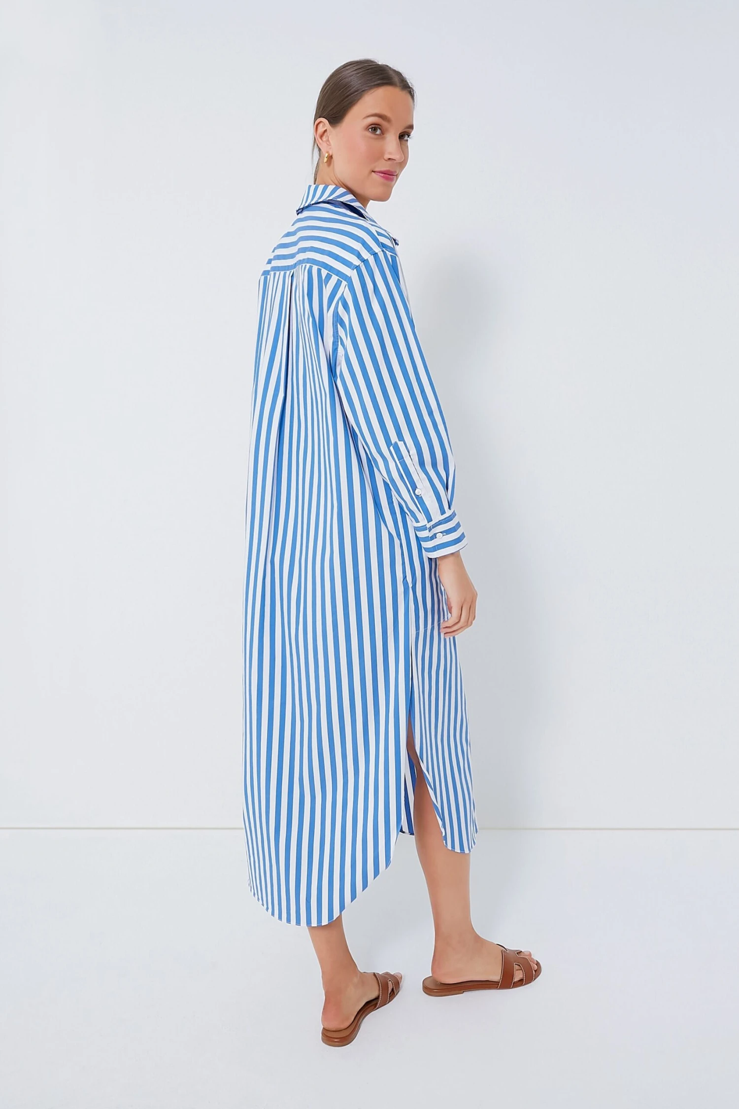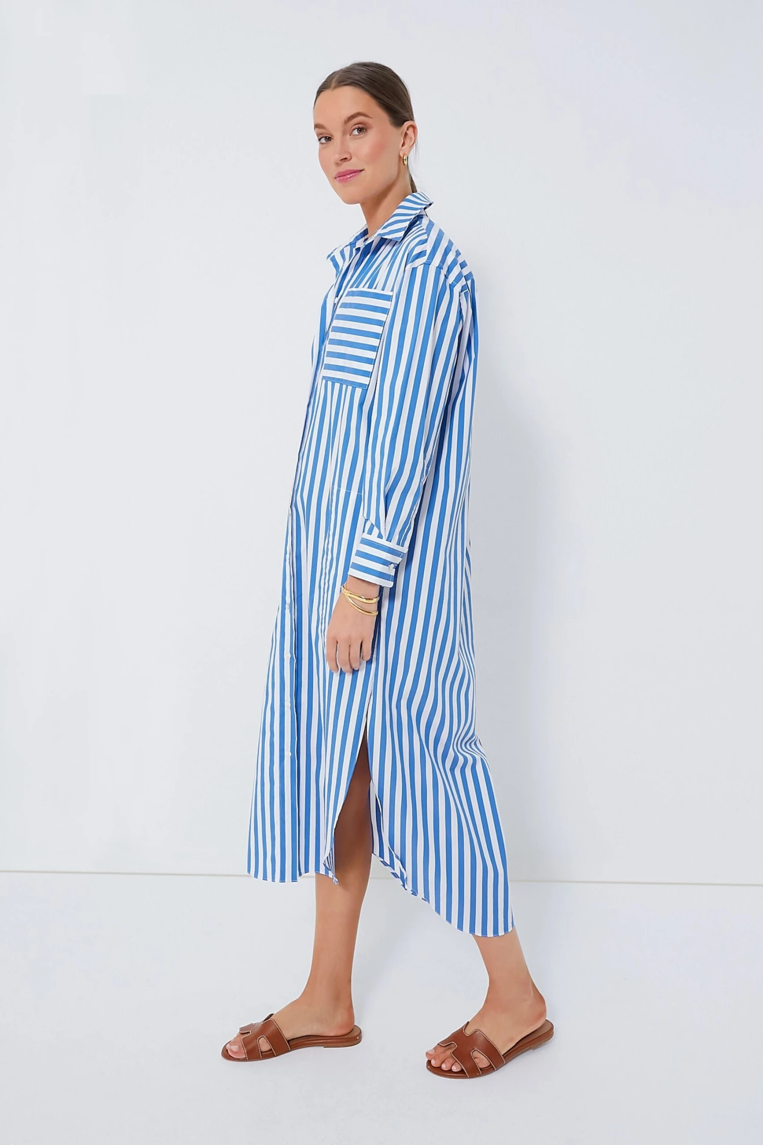 You can never go wrong with a shirt dress, which is why we love the Constance Maxi. Surprising details include the front patch pocket with horizontal stripes and the two side pockets with stitched detailing for a utilitarian touch. While the side slits and high to low hem add a feminine flair to this blue and white striped stunner. From desk to drinks, we pairing this always on-trend number with flats and gold accessories.