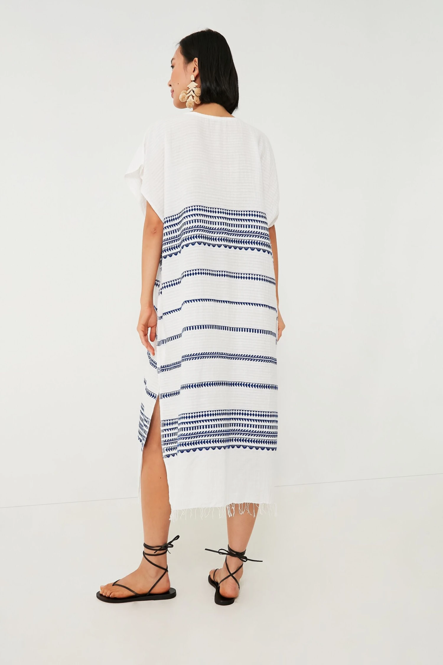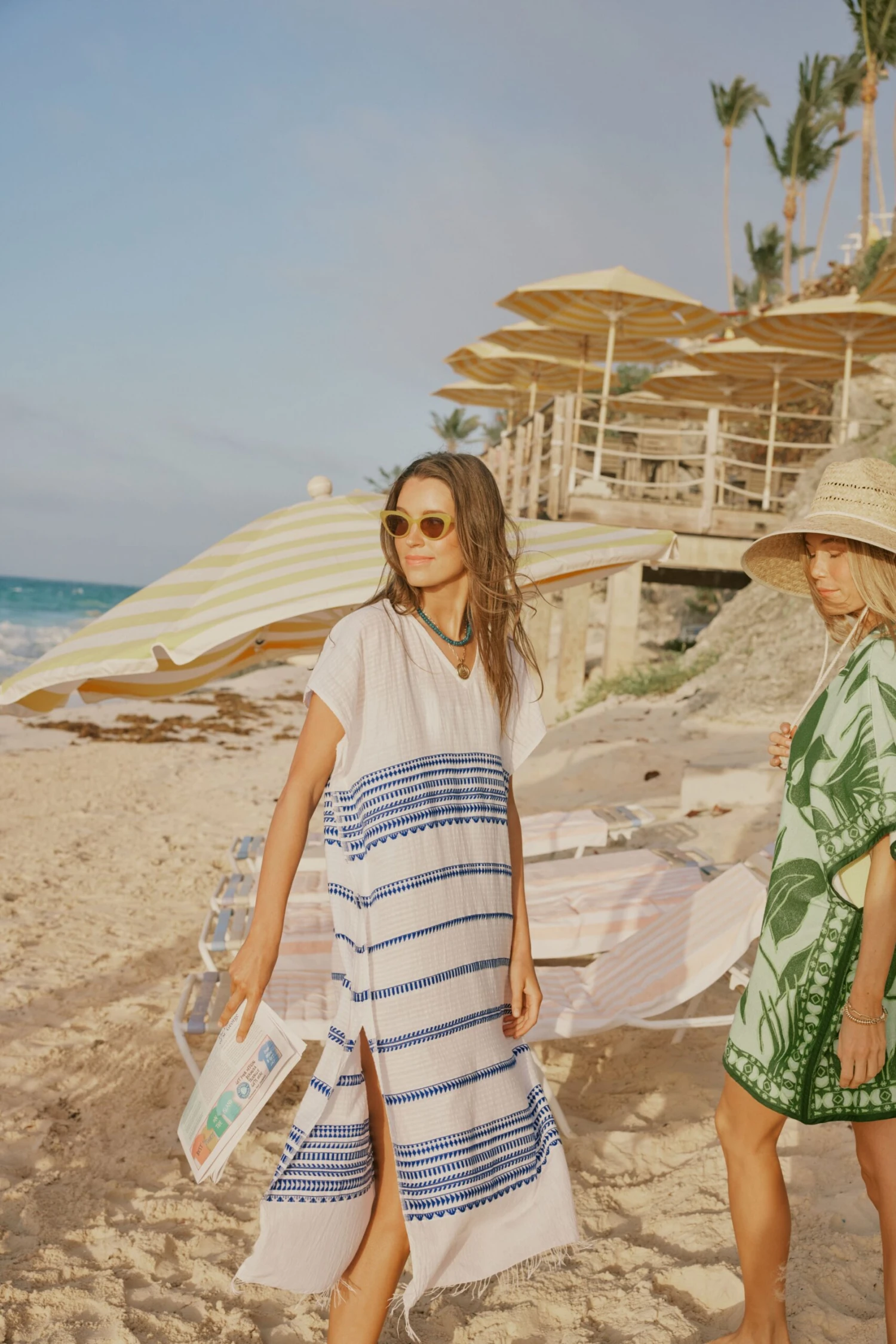 Simple yet sophisticated, we are taking the Blue Yani Classic Caftan with us on beach days, tropical getaways, and girls weekends this season! Handmade from traditional Ethiopian tibeb cloth, this midi silhouette with a notched neckline, batwing sleeves, and a fringed hem has you covered on even the sunniest, hottest days ahead. The flowy shape will float beautifully upon the ocean breeze and ensure you look and feel cool when you pair it with a sunhat and sandals for a day by the pool or a stroll on the sand.