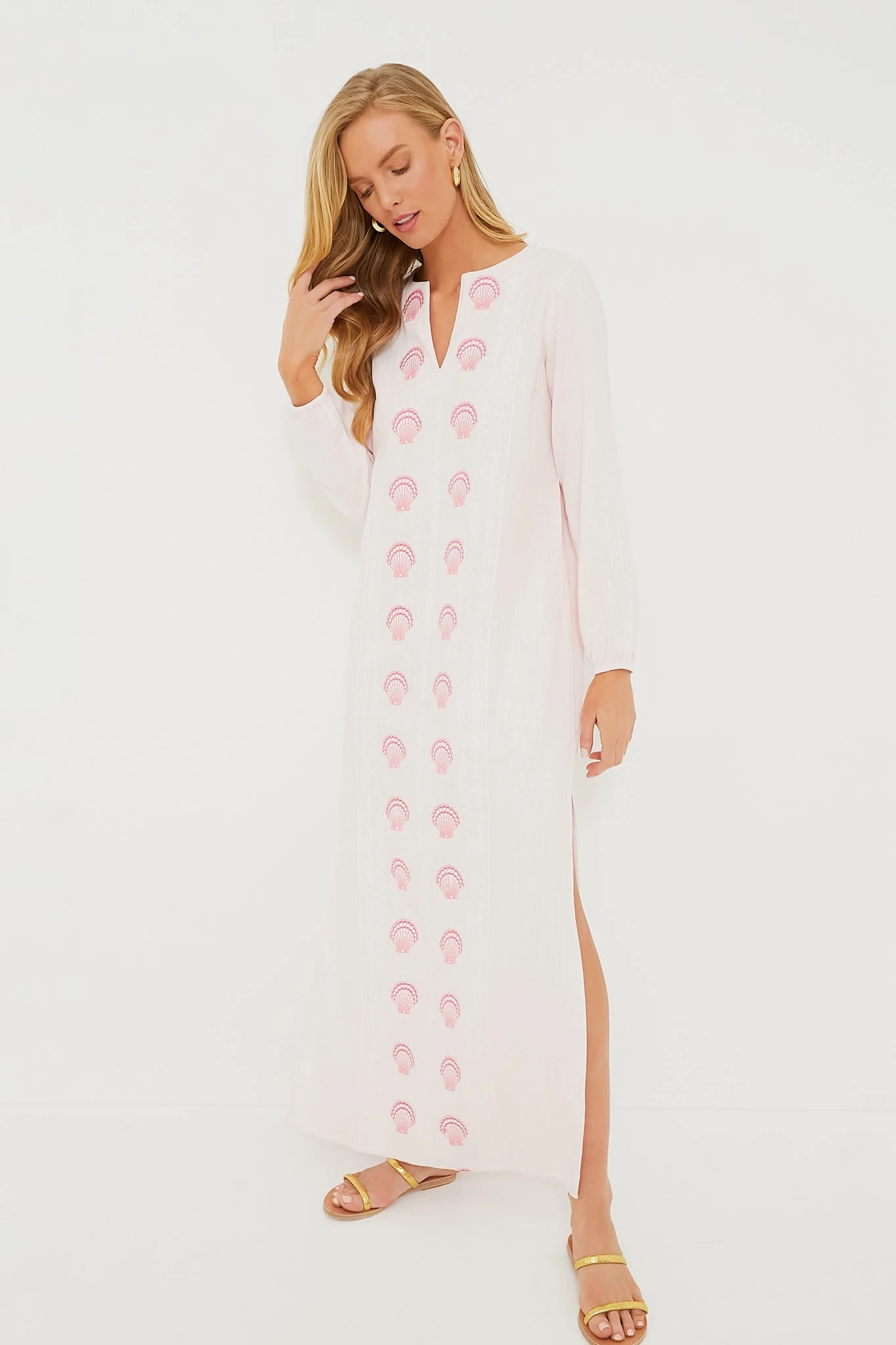 The perfect beach to drinks look, the Blush Embroidered Caftan is complete with seashell motifs lining the front, a V-neckline, and long blouson sleeves. The side slits allow for easy movement in this straight silhouette, and the lightweight cotton provides comfort on even the sunniest of days. Throw on over your suit with sandals, or with espadrilles and statement earrings.