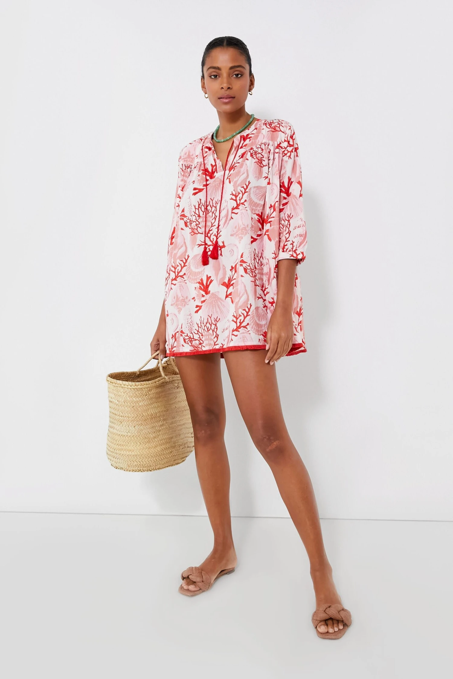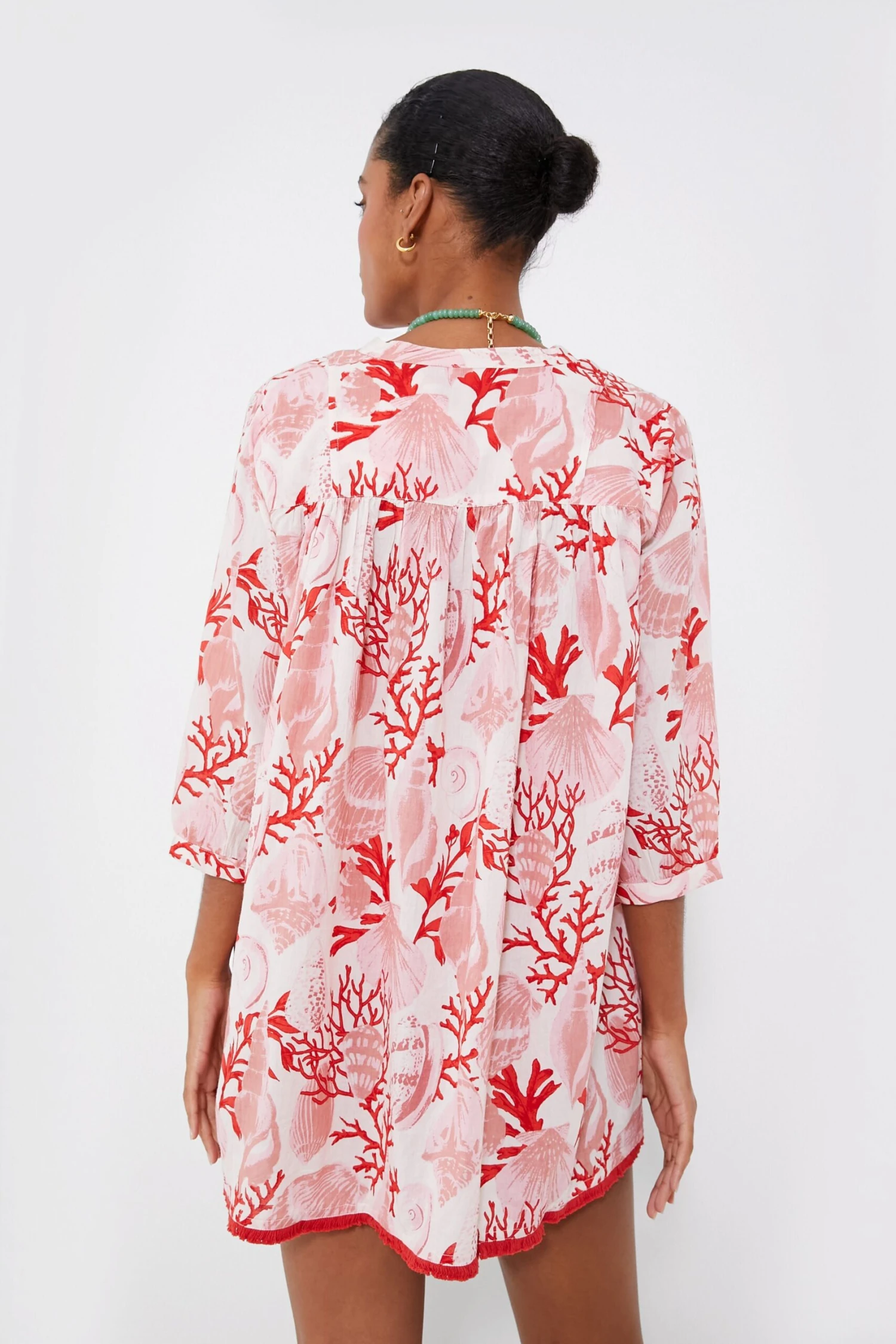 Vibrant colors meets casual coolness with the Coral Brights Bondi Coverup. Pink hues make up the oceanic fauna that decorate the body and are neatly accented by red fringe along the hem and corded tassel neckties that allow you wear this style open or done in a bow. With three-quarter length sleeves to keep you protected from the sun but won’t leave you overheated and a flirty mini length for a breezy feel, we are wearing this everywhere from backyard pool parties to sailing the high seas, just grab a pair of sandals and sunnies are you’re all set.