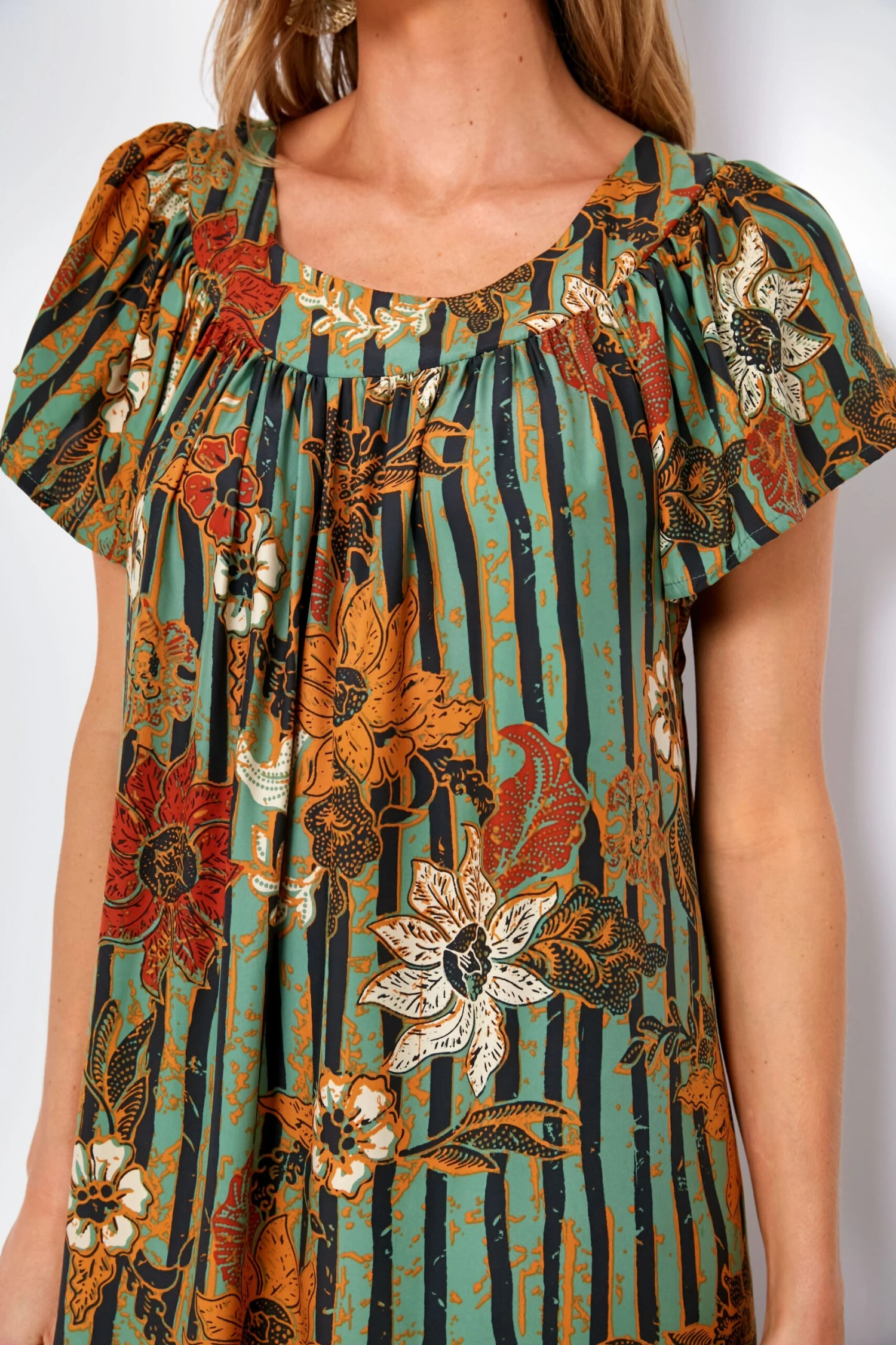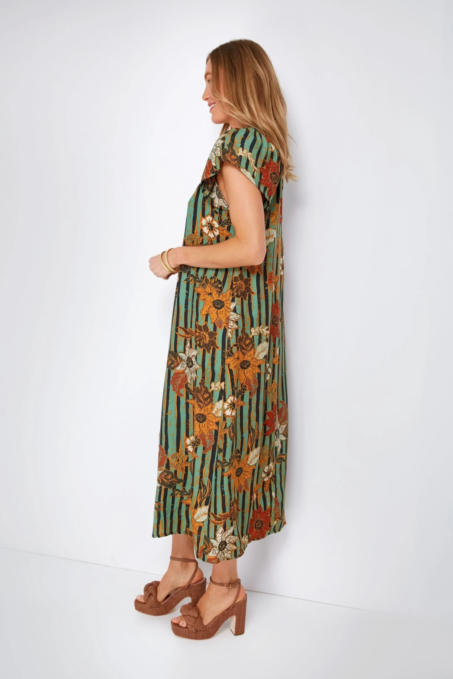In earth-toned hues perfect for days spent in the sun, the Green Stripe Moss Sienna Dress is simple in its construction to complement that incredible sunflower print. An easy-breezy, relaxed fit ensures you stay comfortable from day to night, while the silk composition adds an element of luxury that will have you feeling your very best. Finished with an elegant round neckline and flutter sleeves, this is a must-have style. Pair with heels and a clutch for elevated occasions, or go a bit more casual with sandals and gold jewelry.