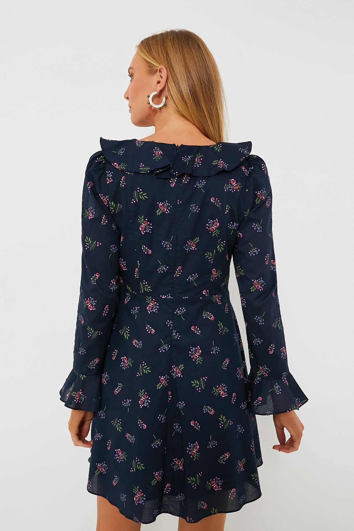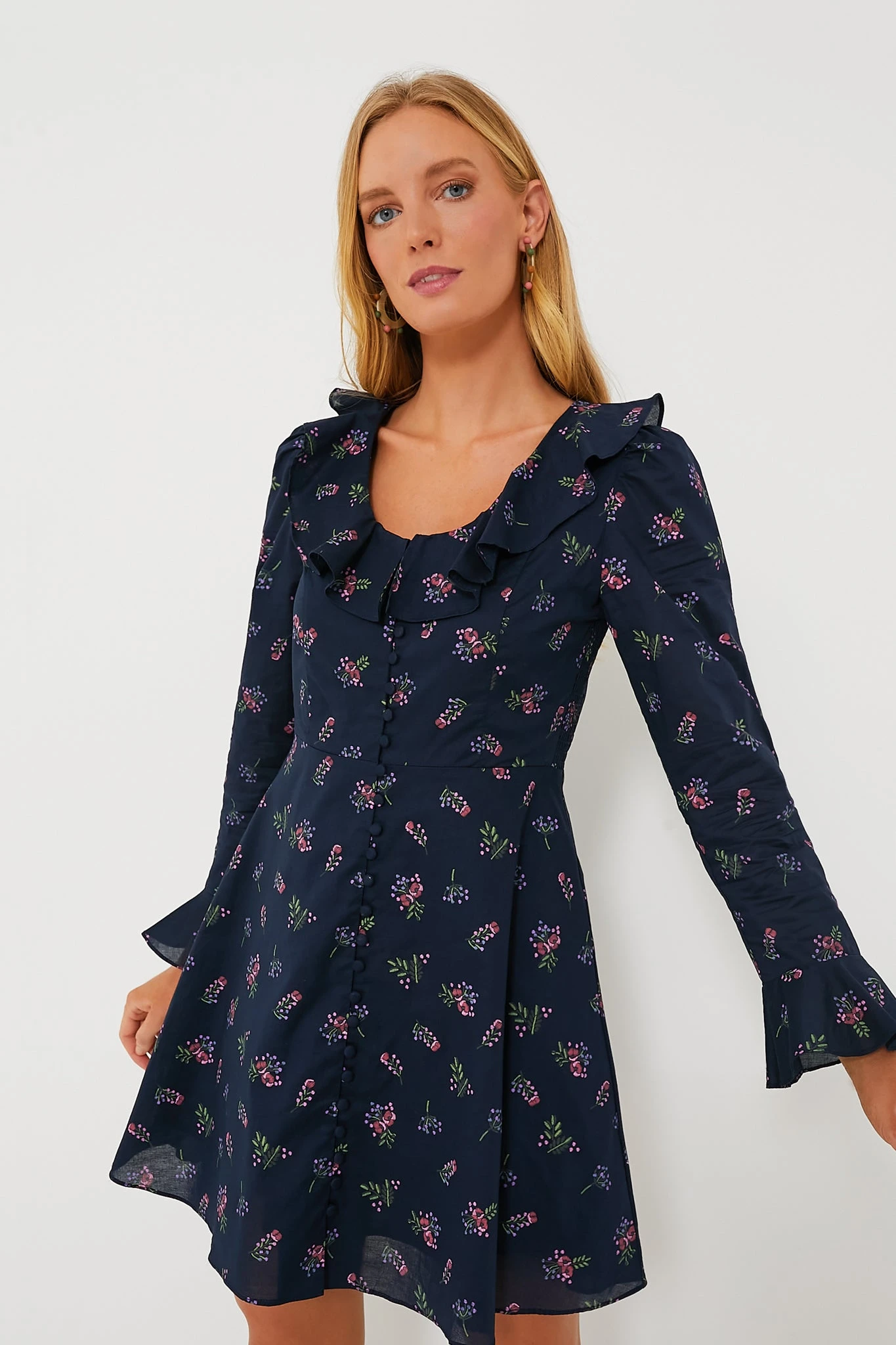 Love the florals but more of a neutral gal? The Norah Dress is made just for you! Designed in a deep navy that’s complemented by the pink and blue bouquet motifs, this mini is finished with ruffle trim on the neckline and cuffs for the perfect flirty silhouette that’s not overly sweet. Perfect for date night or evening drinks with the gals, this effortlessly polished style is a wardrobe winner.