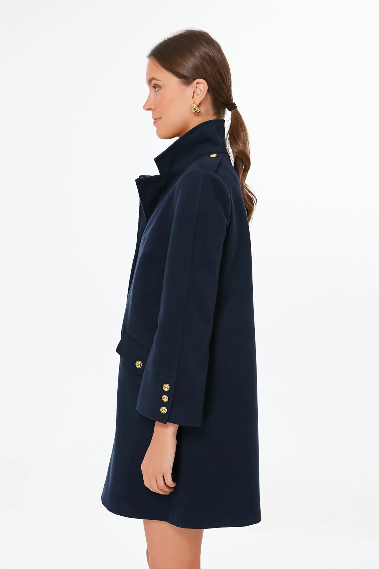 - Gold button details on cuffs, placket, and pockets