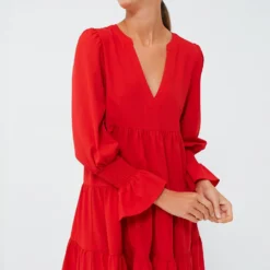 Introducing the a customer favorite, the Crepe Kenzo Dress. Featuring feminine flutter smocked cuffs, a V-neckline and a loose empire waist, this is the most flattering flirty frock! In a fiery red shade, pair this sassy number with flats for a casual look or dress up with heels and statement earrings for date night.