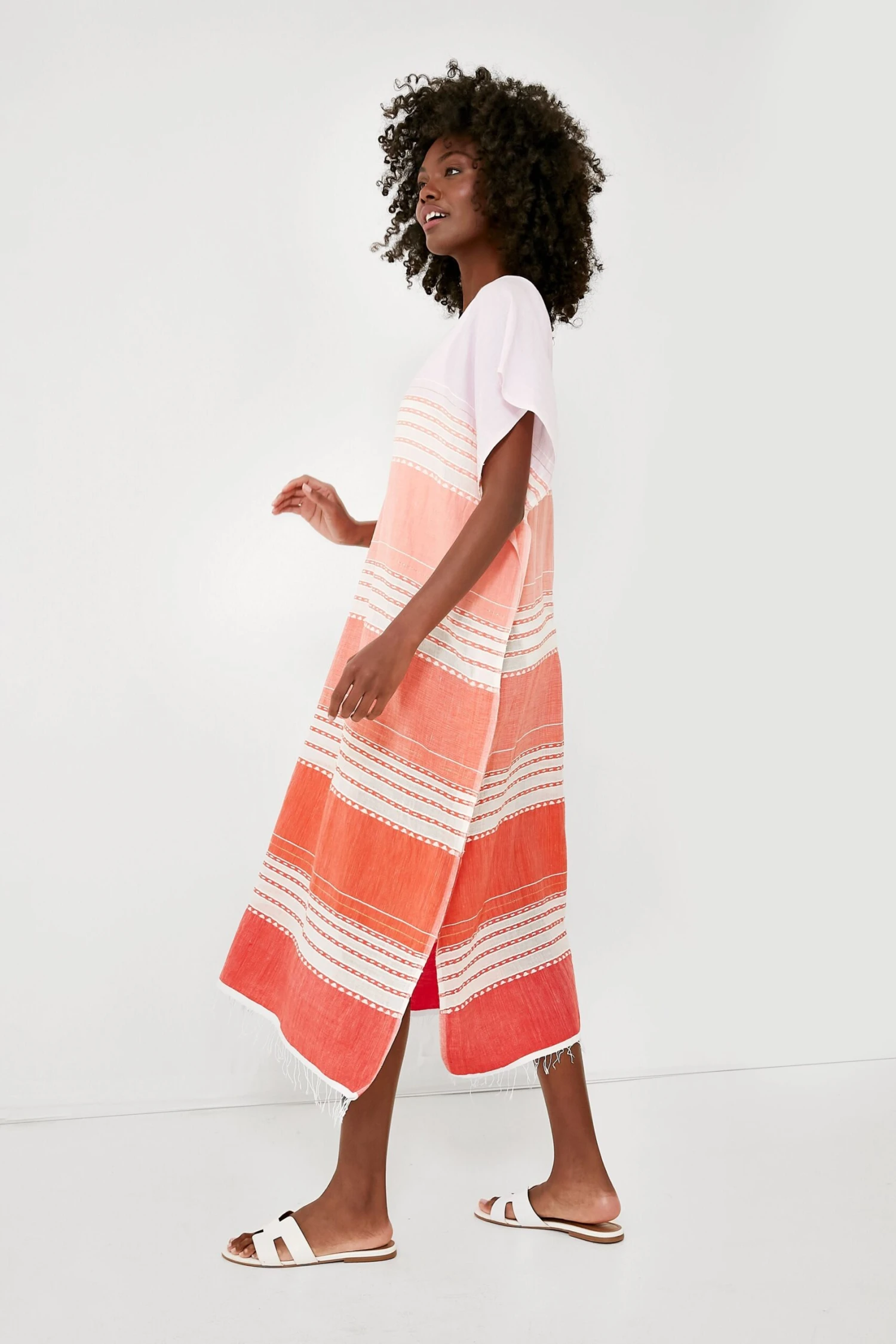 With a gradient of stripes made to evoke sunrise and sunset, the Tangerine Eshal Classic Caftan is the easy breezy number you’ve been searching for. Simple yet stylish details including a V-neckline, cap sleeves, and a fringed hem make this midi the life of the party for beach days, seaside happy hours, and poolside hangouts. Handwoven from Ethiopian tibeb cloth for a lightweight and airy composition, this is a wardrobe winner for sure!
